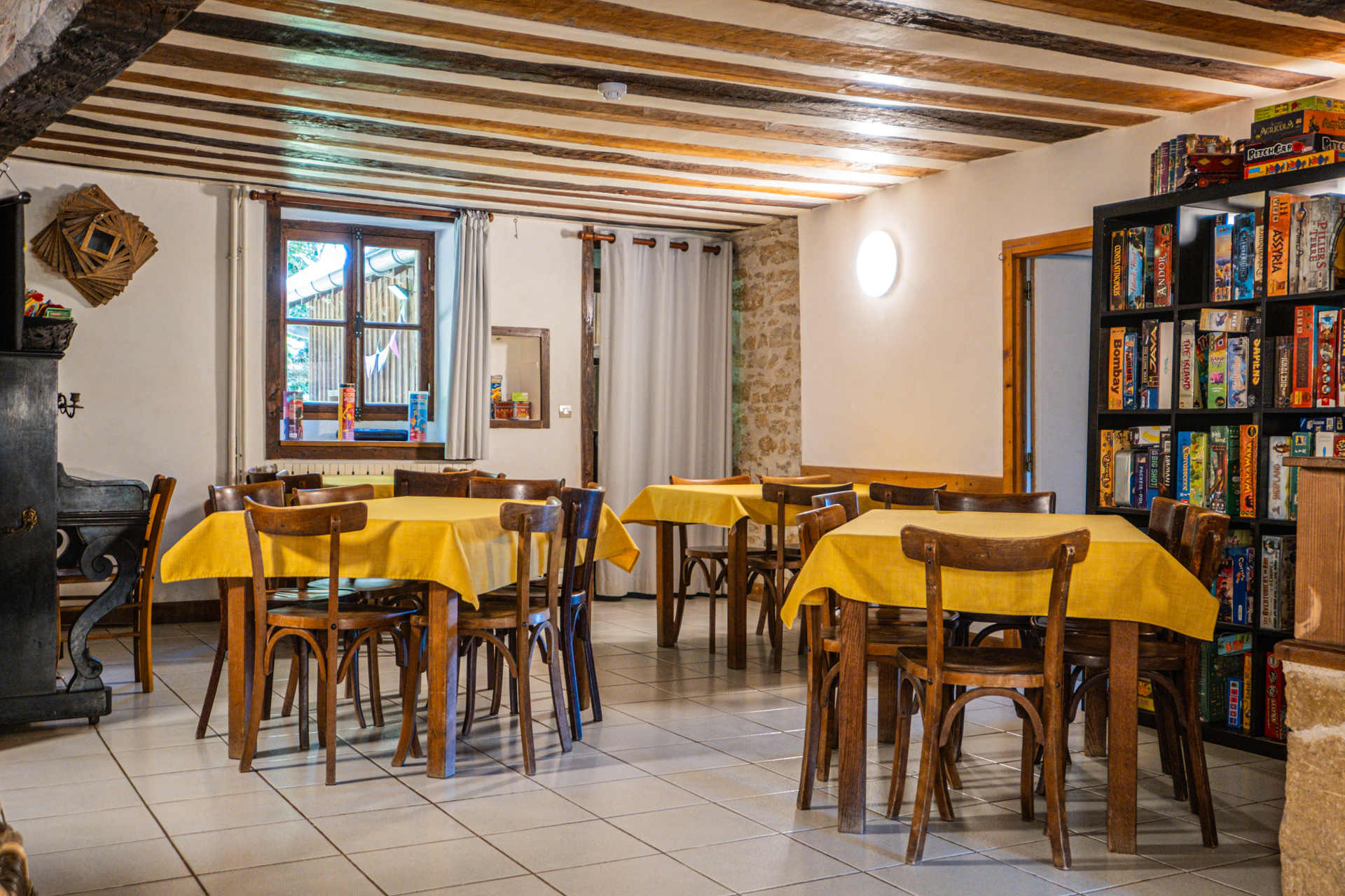 La salle d’auberge de 70 m2 avec sa cheminée ouverte, ses poutres et pierres apparentes peut accueillir jusqu’à 40 convives. C’est aussi ici que vous trouverez une ludothèque de plus de 400 jeux de société.