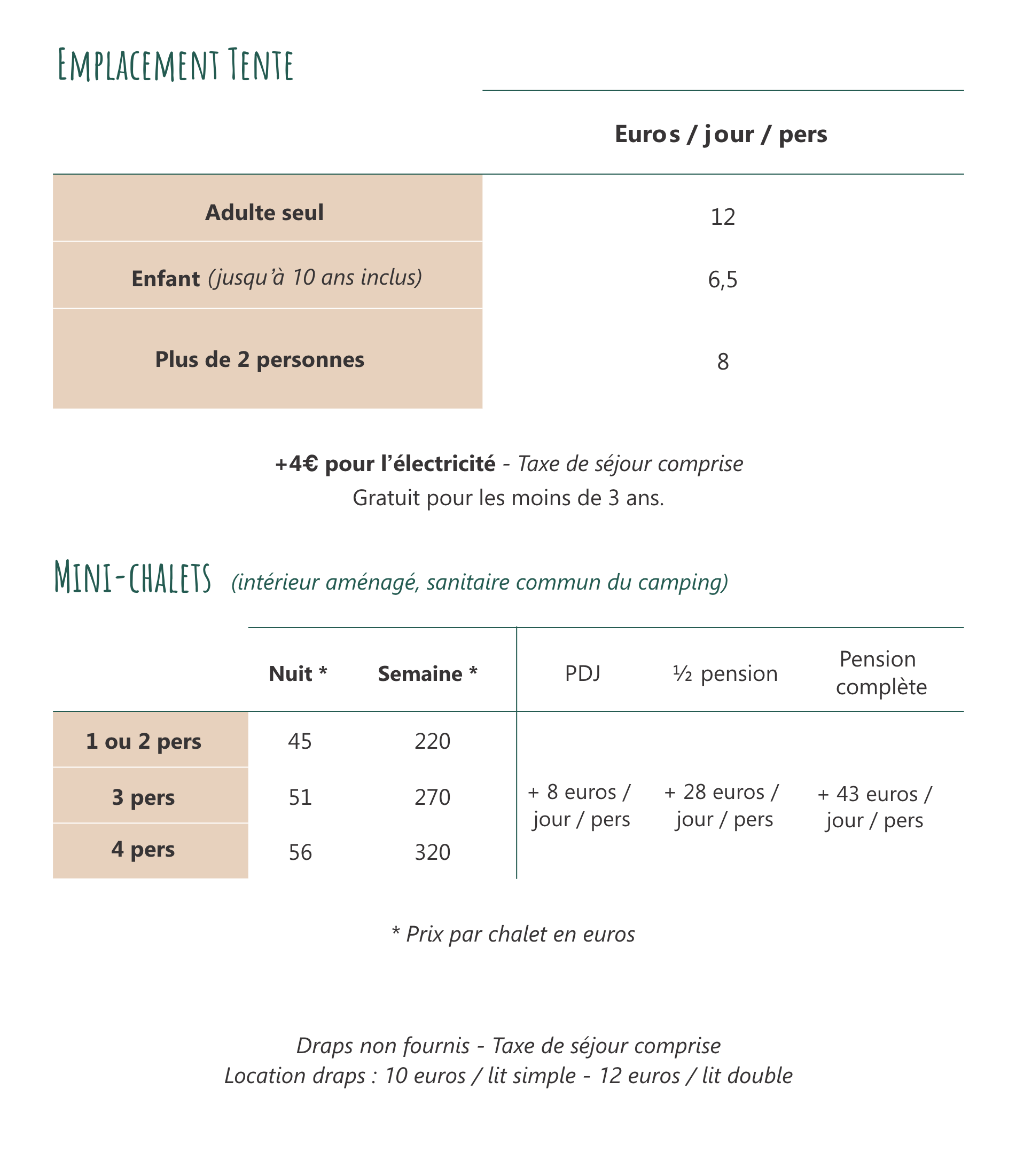 Le camping est arboré et dispose de sanitaires, de 14 emplacements pour tentes et 4 mini-chalets équipés dont un de 3 personnes adapté aux personnes à mobilité réduite.
